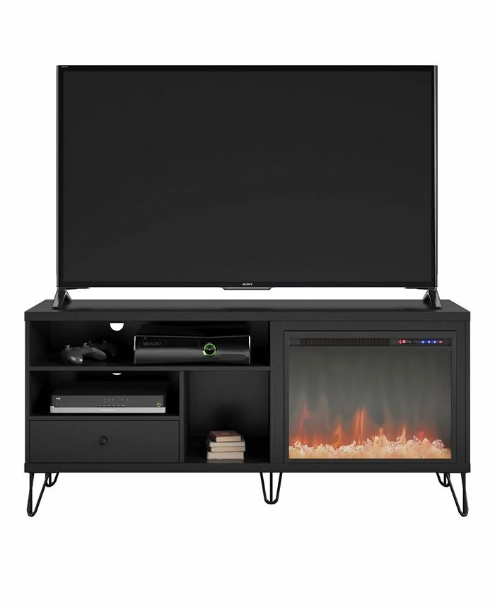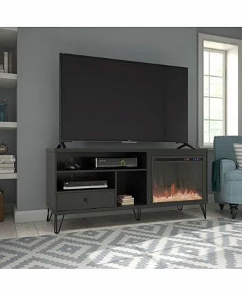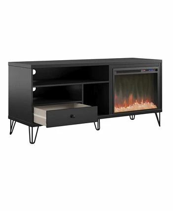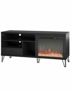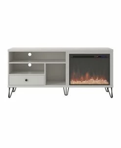 - Get a mid-century modern look with a fireplace bonus with the A Design Studio Maxwell fireplace TV stand for TVs up to 65″ wide or 120 pounds