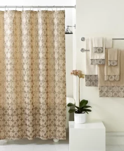 Cosmic chic. Featuring a sophisticated design of embroidered circles in shimmering silver, the Galaxy shower curtain from Avanti outfits your bath in planetary perfection.