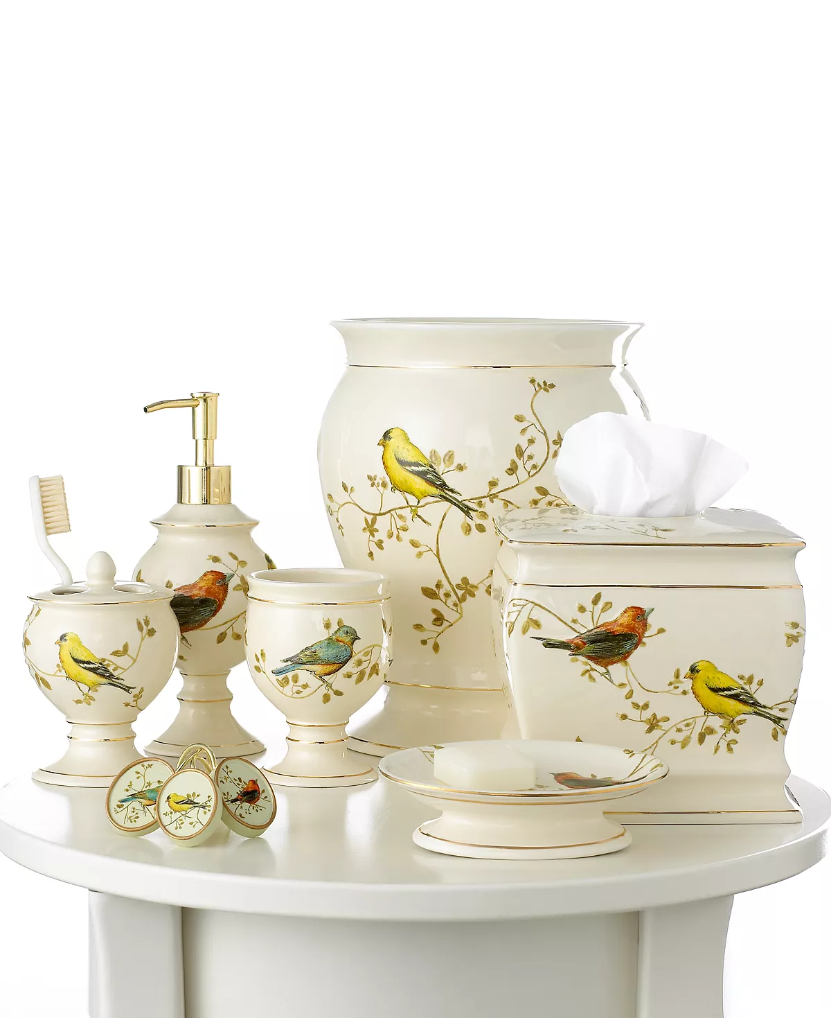 Featuring gold accents and raised-decal birds on smooth ceramic, the Gilded Birds soap and lotion dispenser accents your space with an air of elegance perfect in any season.