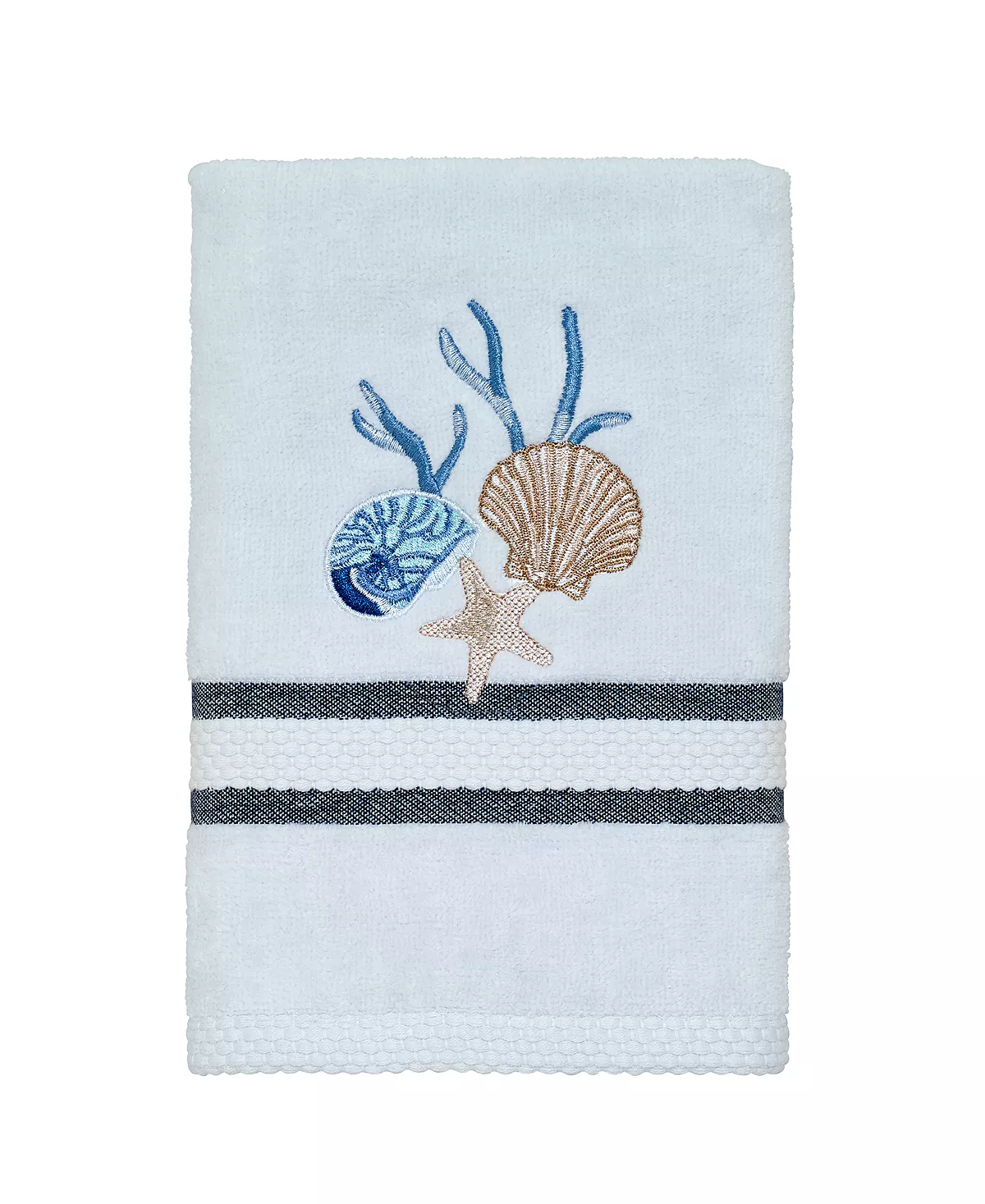 The Avanti Blue Lagoon Hand Towel features a beautifully embroidered underwater scene of shells, starfish and coral in shades of blue and beige on a 100% cotton white terry towel. The towel is finished with 2 coordinating navy horizontal stripes.