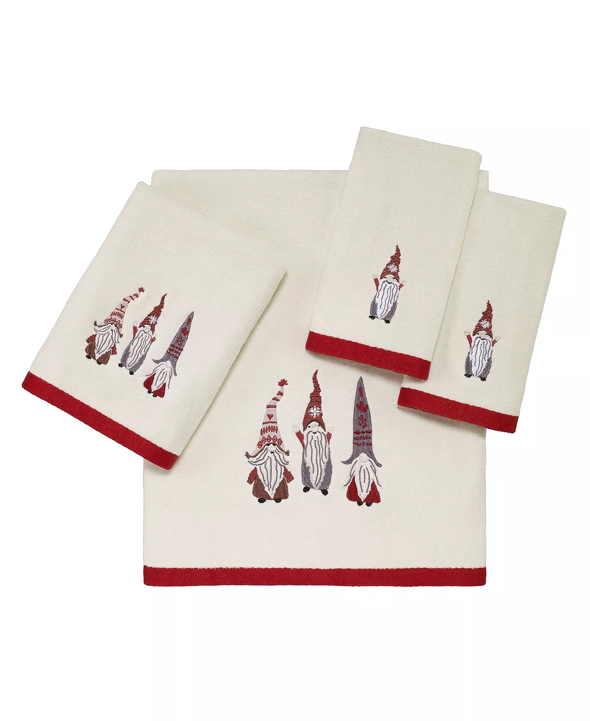 The Avanti Christmas Gnomes Bath Towel features 3 embroidered festively dressed gnomes on a exclusive of embellishment and border ivory velour towel. Towel is finished with a coordinating red polyester border.