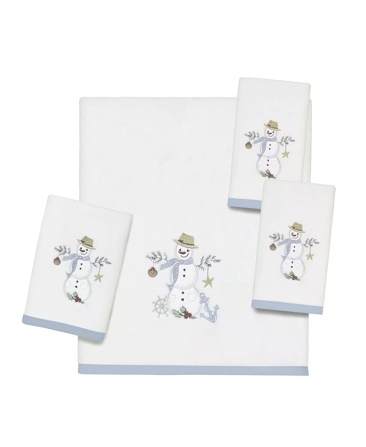 The Avanti Coastal Snowman Bath Towel features an embroidered smiling snowman with a straw hat, polka-dotted scarf and holly with seashells, starfish, ship’s wheel and anchor one white velour towel. Finished with a coordinating light blue polyester border.
