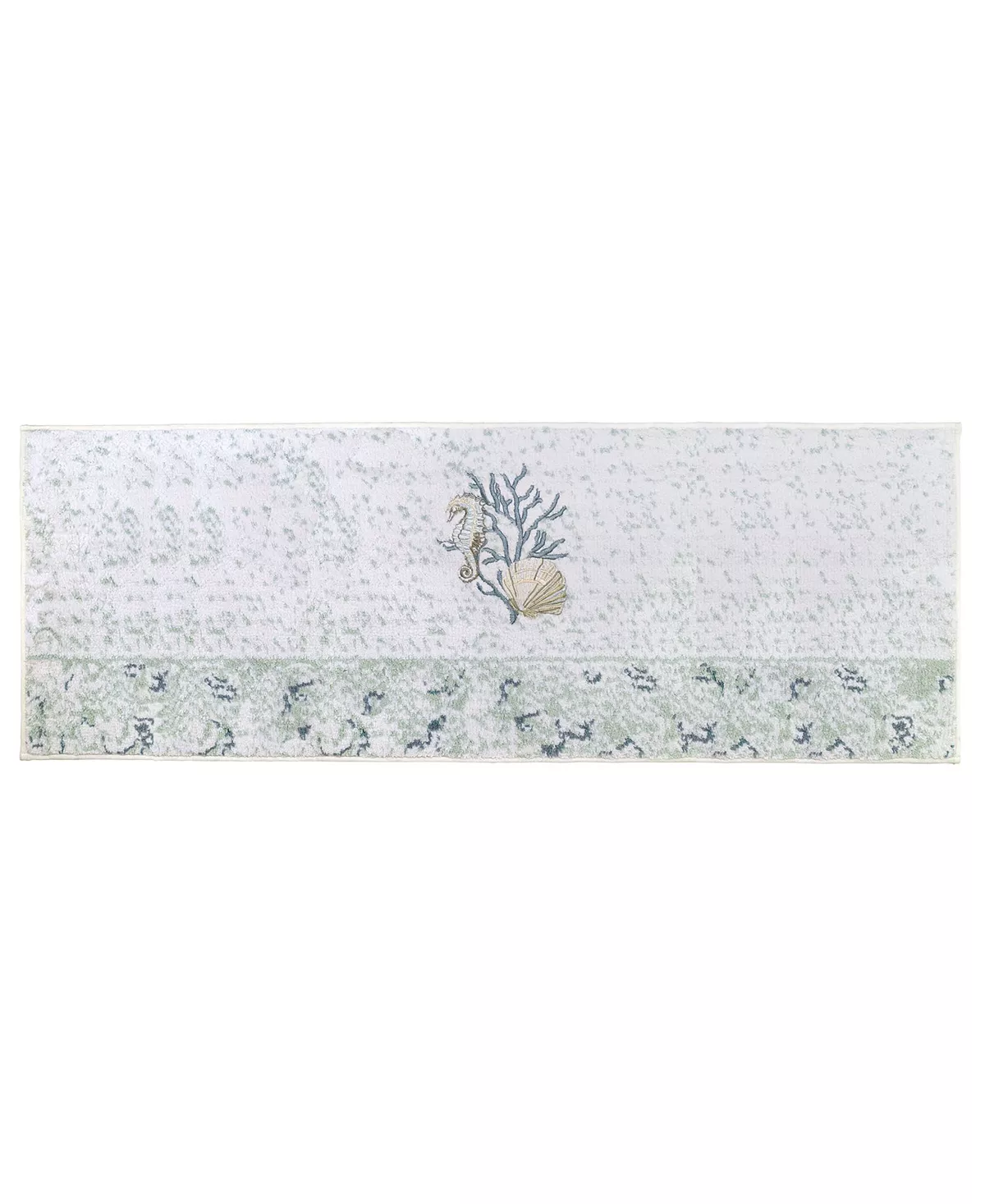The Avanti Coastal Terrazzo rug is tufted in cotton and embroidered with a nautilus and starfish. The rug has a border top and bottom. This oversized rug is skid resistant.