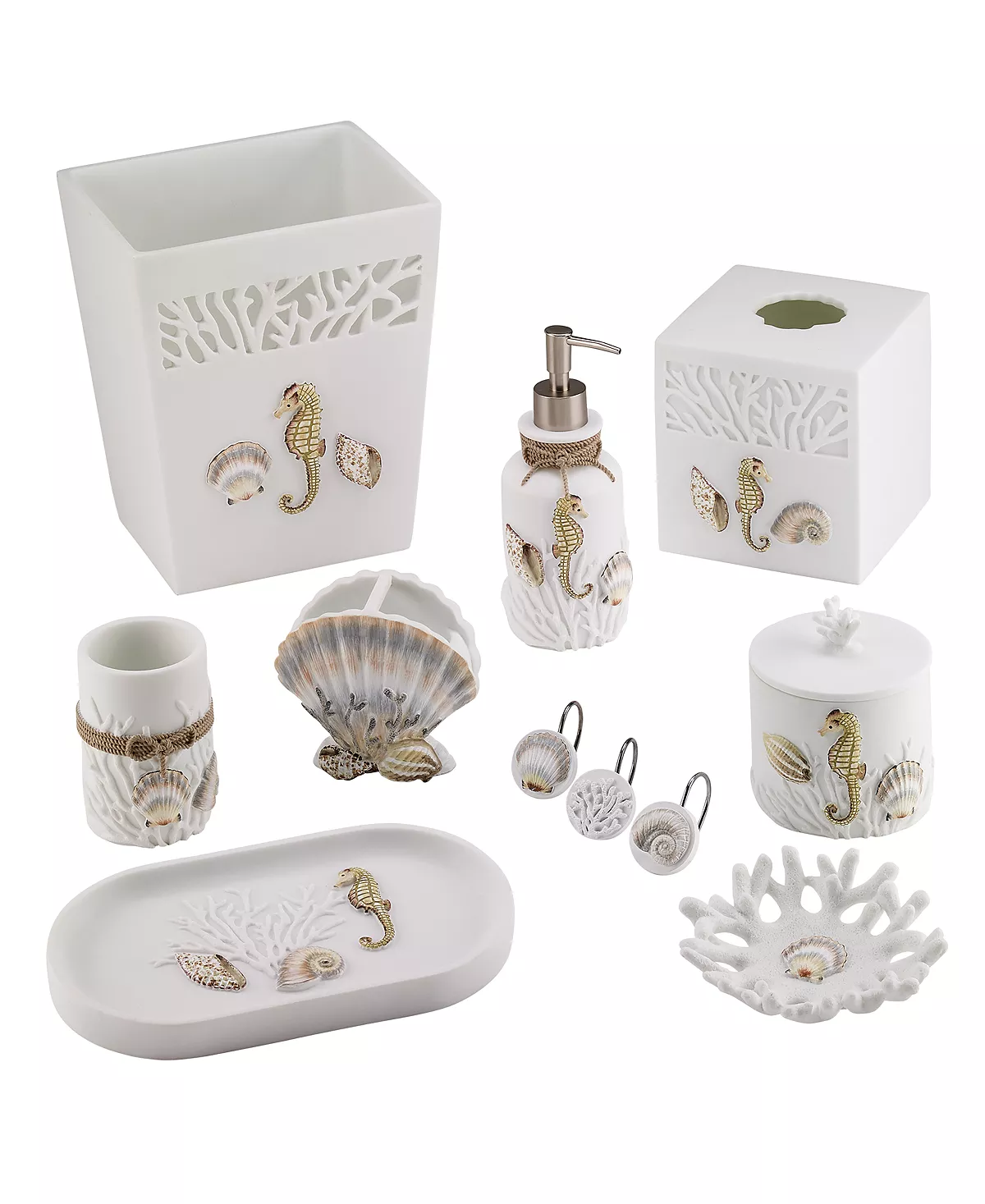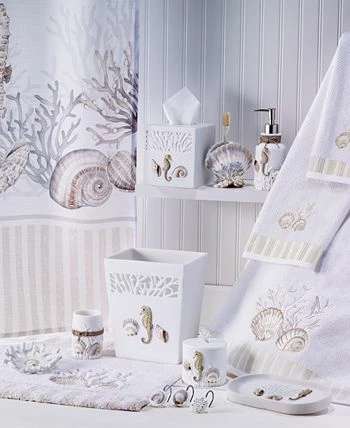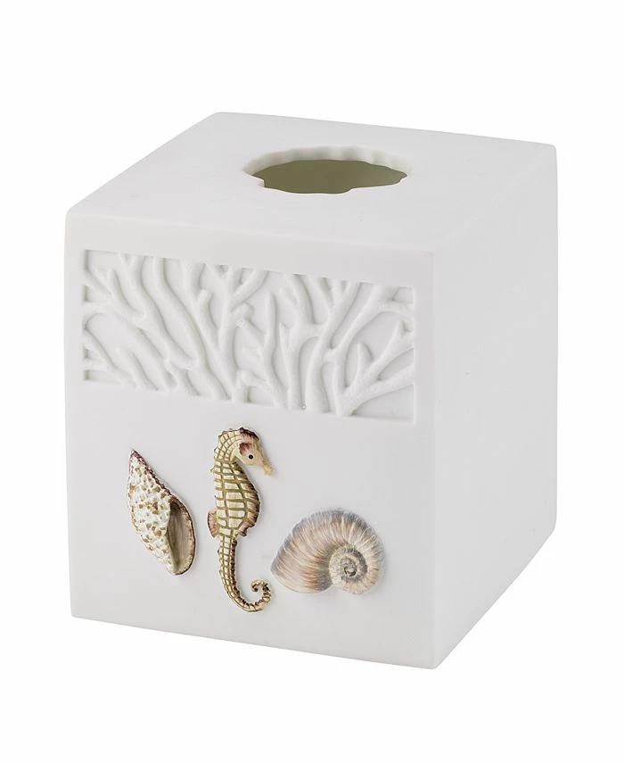 The Avanti Destin Tissue Cover features an intricately detailed seahorse and shell with coral in relief on a white ground. Hand-painted and crafted in durable resin.