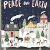 The Avanti snowmen gathering decorative tray features a happy snowman with plaid scarf and hat with a pine tree and three snowflakes on a tan background. The edge is finished in ivory with linen brushstrokes.