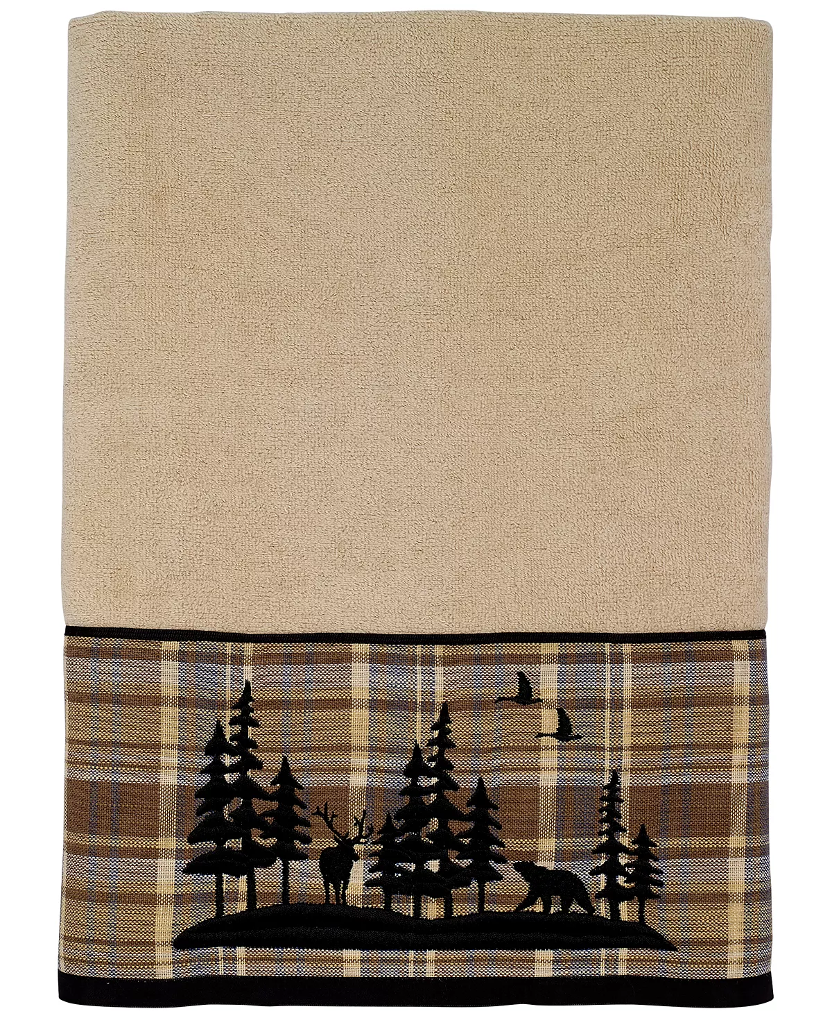 The Avanti Woodville towel collection features an outdoor lodge scene silhouetted in embroidery on a plaid fabric band for the bath and hand towel finished with matching color ribbon. Coordinating Fingertip Towel have the embroidery outdoor motif.