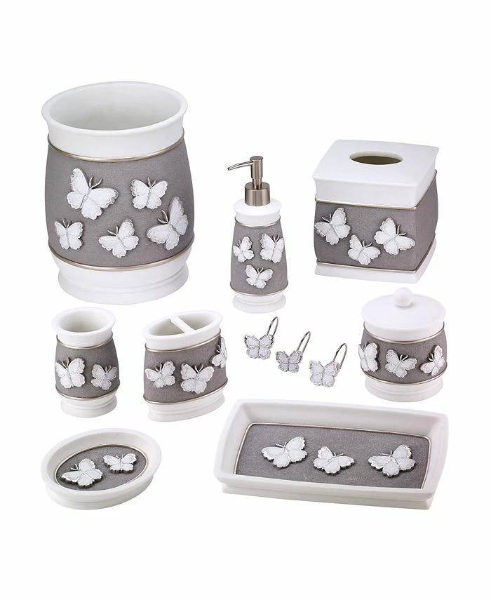 The Avanti Yara Bath Collection features delicate white and silver butterflies on a grey background with white borders. The subtlety, beauty and sophistication comes through on the printed shower curtain, embroidered rug, bordered towel and resin bath accessories with three dimensional butterflies. Transform your bathroom with the Yara Collection.