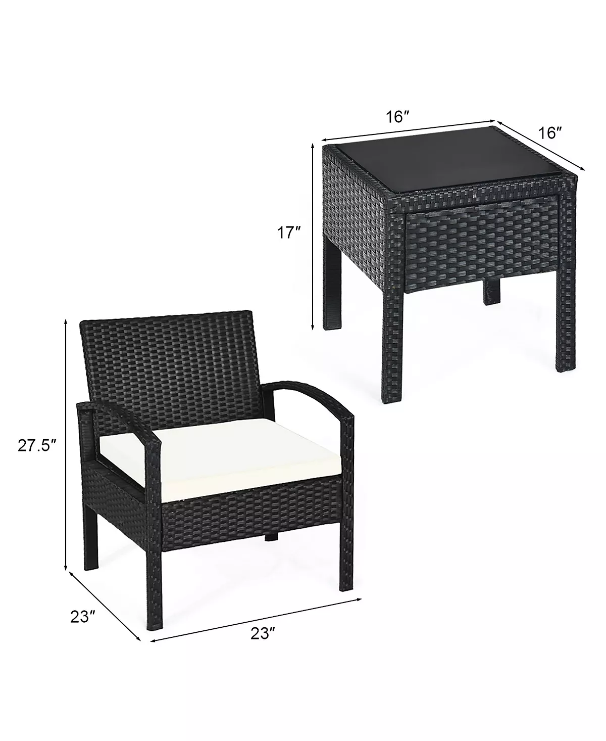 - Dimension of Patio Conversation Set: Chair: 23″ x 23″ x 27.5″ (L x W x H), coffee table: 16″ x 16″ x 17″ (L x W x H), weight capacity of chair: 350 lbs, weight capacity of coffee table: 220 lbs.