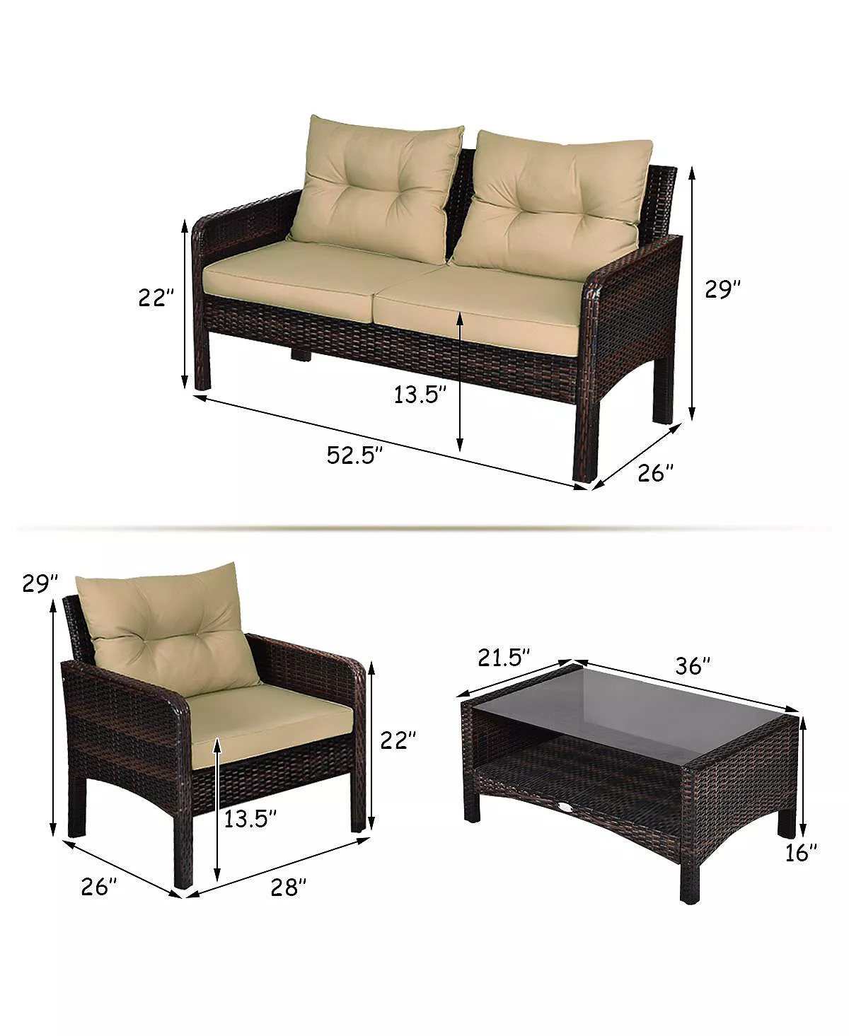 - Single Chair Dimension: 28″ x26″ x29″(L x W x H) ,Loveseat Dimension: 52.5″ x 26″x 29″(L x W x H) ,Coffee Table Dimension: 36″ x 21.5″ x 16″(L x W x H)