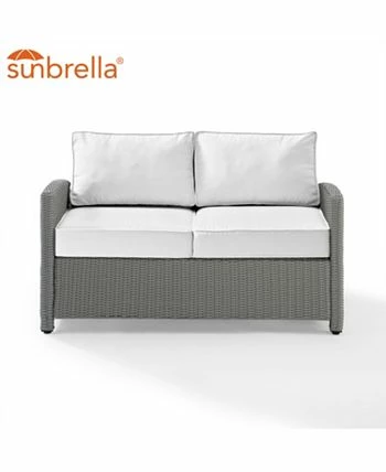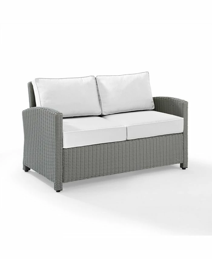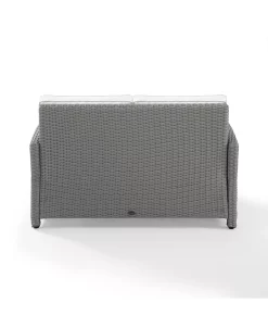 The sturdy frame is wrapped in beautiful all-weather wicker with gently arched arms for comfort. Enjoy the look of bright white outdoor cushions worry-free. Featuring a thick cushion covered in high-quality fabric, this loveseat resists staining, discoloration, moisture abrasion and mildew.