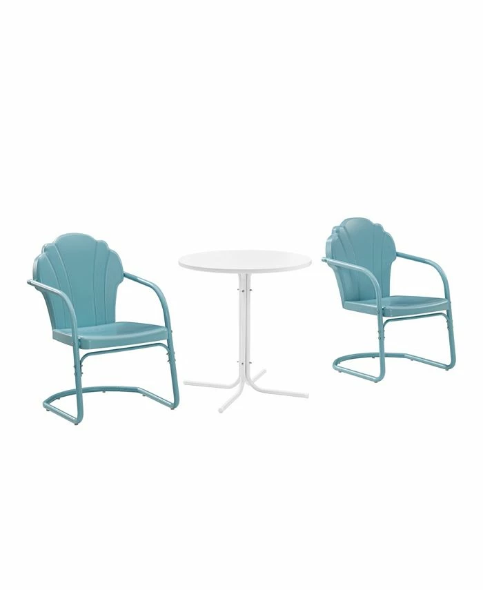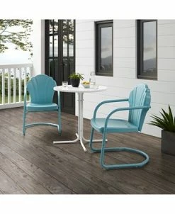 Two scalloped chairs in vibrant colors surround a simple metal bistro table. The retro silhouette of each chair sits atop a cantilever base that provides just enough flex for lounging in comfort. The table’s sturdy pedestal base is comprised of four metal legs.