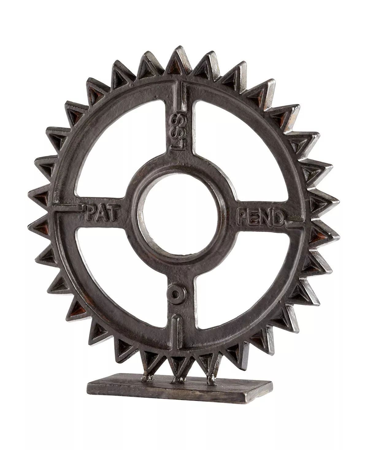 Evoke an industrial sensibility in a living area or home office with this engaging gear sculpture. Boasting a bronze finish over iron construction, the sculpture is set vertically within a minimalist stand perfect for a side table or credenza.