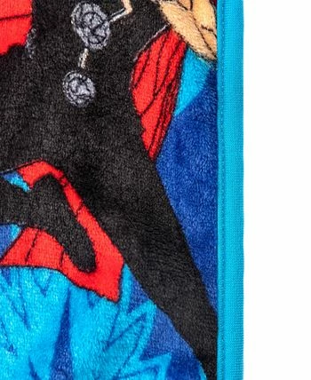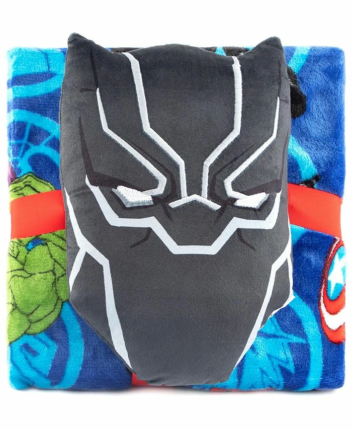 Avengers 40″x50″ Travel Blanket Nogginz. Blanket is patterned with Hulk, Capt America, Black Panther, Thor, and Spiderman with a coordinating Nogginz pillow the Black Panther mask. 100% Microfiber, making them very soft and comfy.