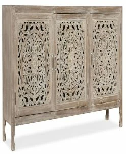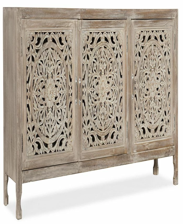 Exquisitely hand carved mango wood on the front of this three-door Entertainment Console creates an iconic and imposing stylish look for your home. The serene neutral finish is accomplished with a cream glaze and heavy distressing over a medium wood tone.