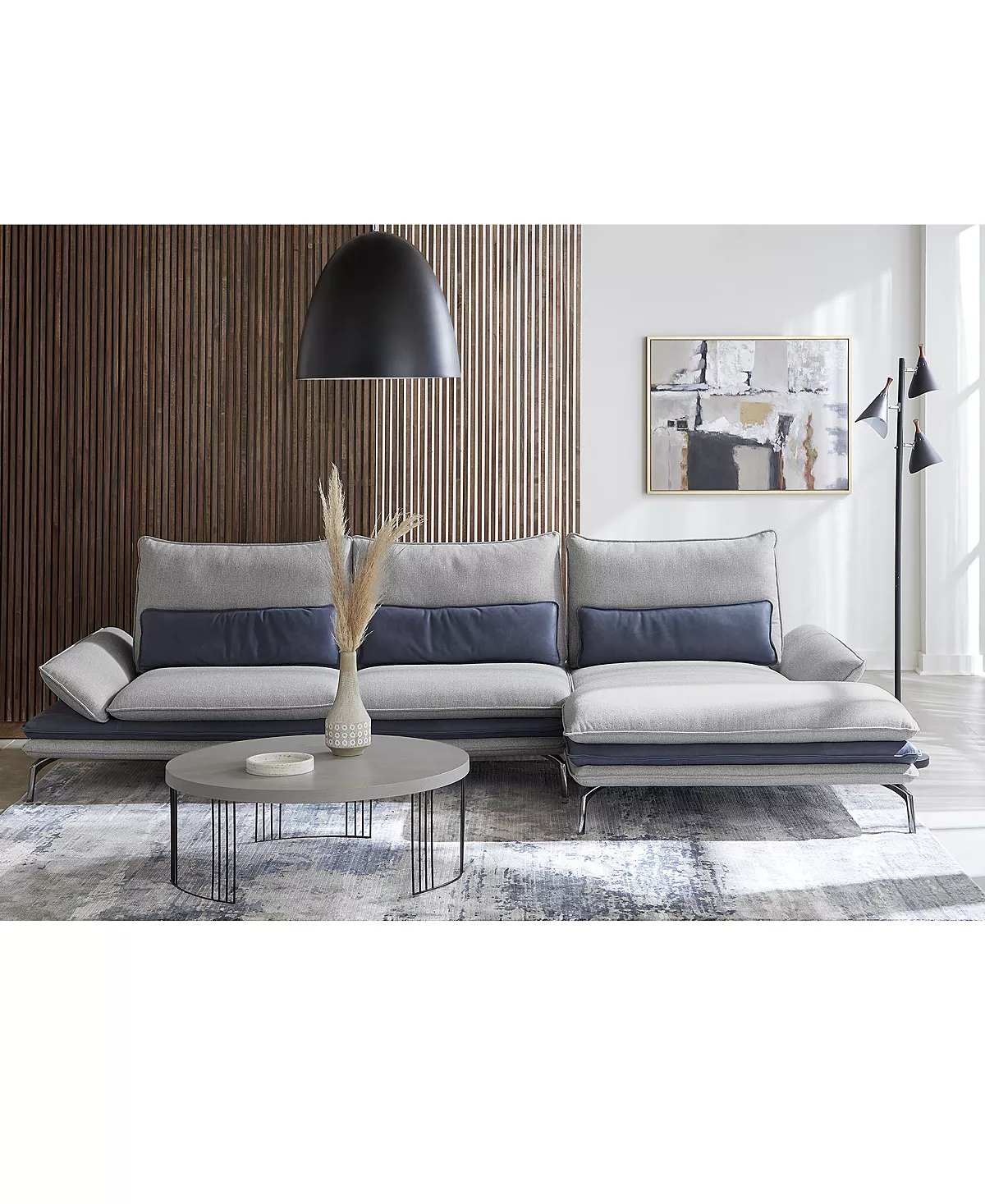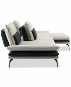 Cultivate an atmosphere of modern minimalism in your home with this edgy two-piece sectional. Standing atop slick metal legs, a sleek-lined frame is rendered with cushions contrasting in both color and material. A pleasing balance of smooth, dark leather and rich-in-hand neutral tone fabric make for a wondrous feel and bold look. Adjustable arms and back cushions enhance the overall appeal of the set by allowing for customizable comfort. A truly eye-catching set for the contemporary home.