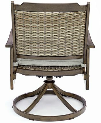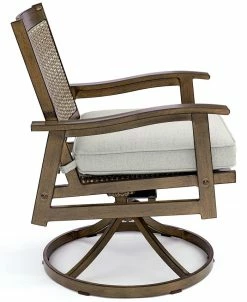 Instantly add to the outdoor seating area of your space with this fine swivel chair. Finished in a hand-applied brown-wood finish along with a slat design that combines a classic style with modern durability, it is topped and grounded with contrasting upholstered cushions for lasting comfort.