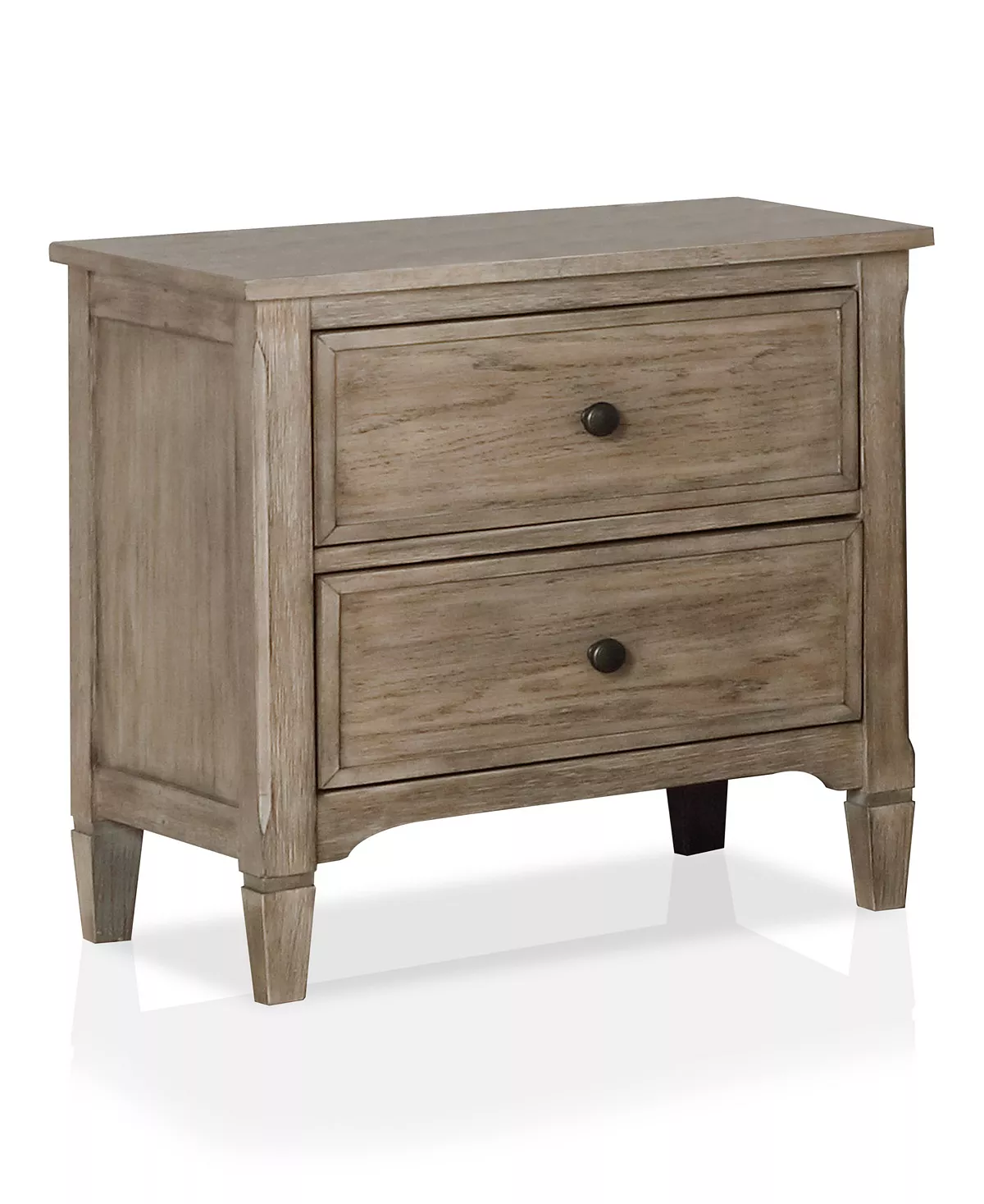 Infuse your personal sanctuary with cool country elegance. This solid wood two-drawer USB nightstand blends a wire brushed warm gray finish with charming round drawer pulls for a classic storage solution with a perfect touch of character.
