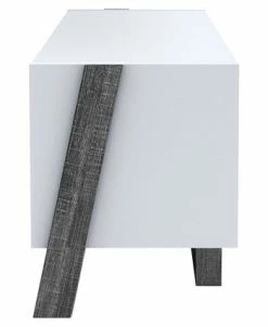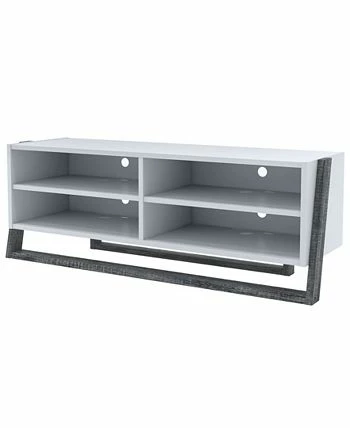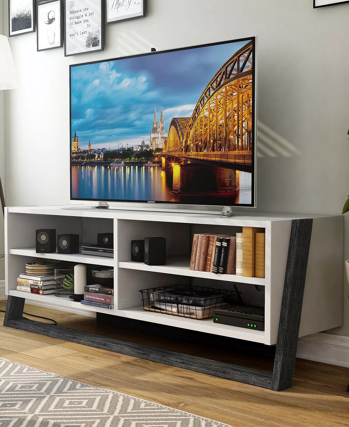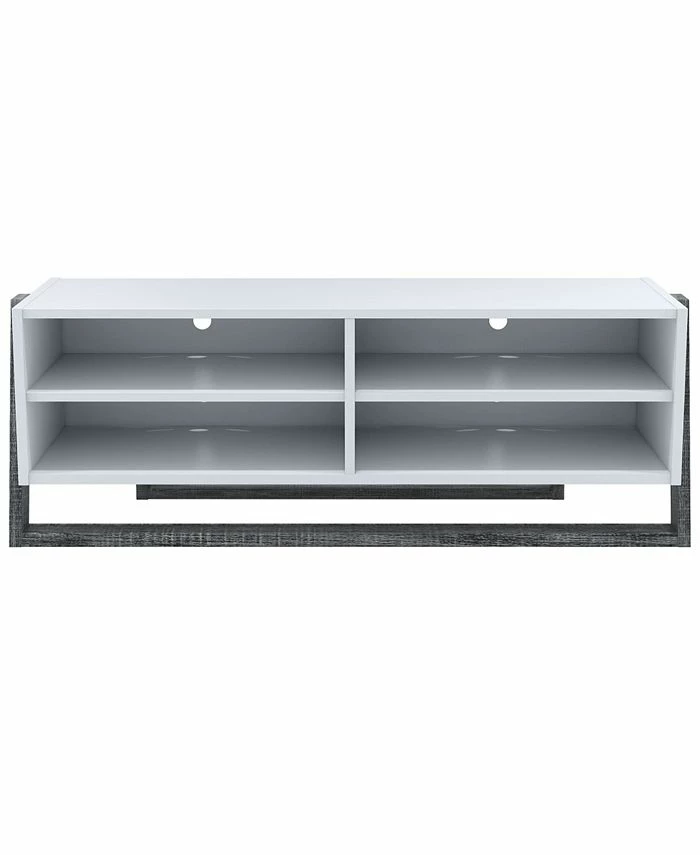Create the entertainment and gaming center of your dreams with this two-tone transitional television stand. Designed for modern living, the stand boasts four roomy shelves, each with a cord management opening to host components like a digital versatile disc player or gaming console.