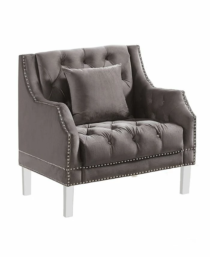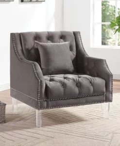Instantly amplify the glam elegance of your living space with the elevated look and feel of this transitional accent armchair. Soft gray flannelette upholstery is complete with diamond button tufting while shaped arms and nail head trim capture attention.