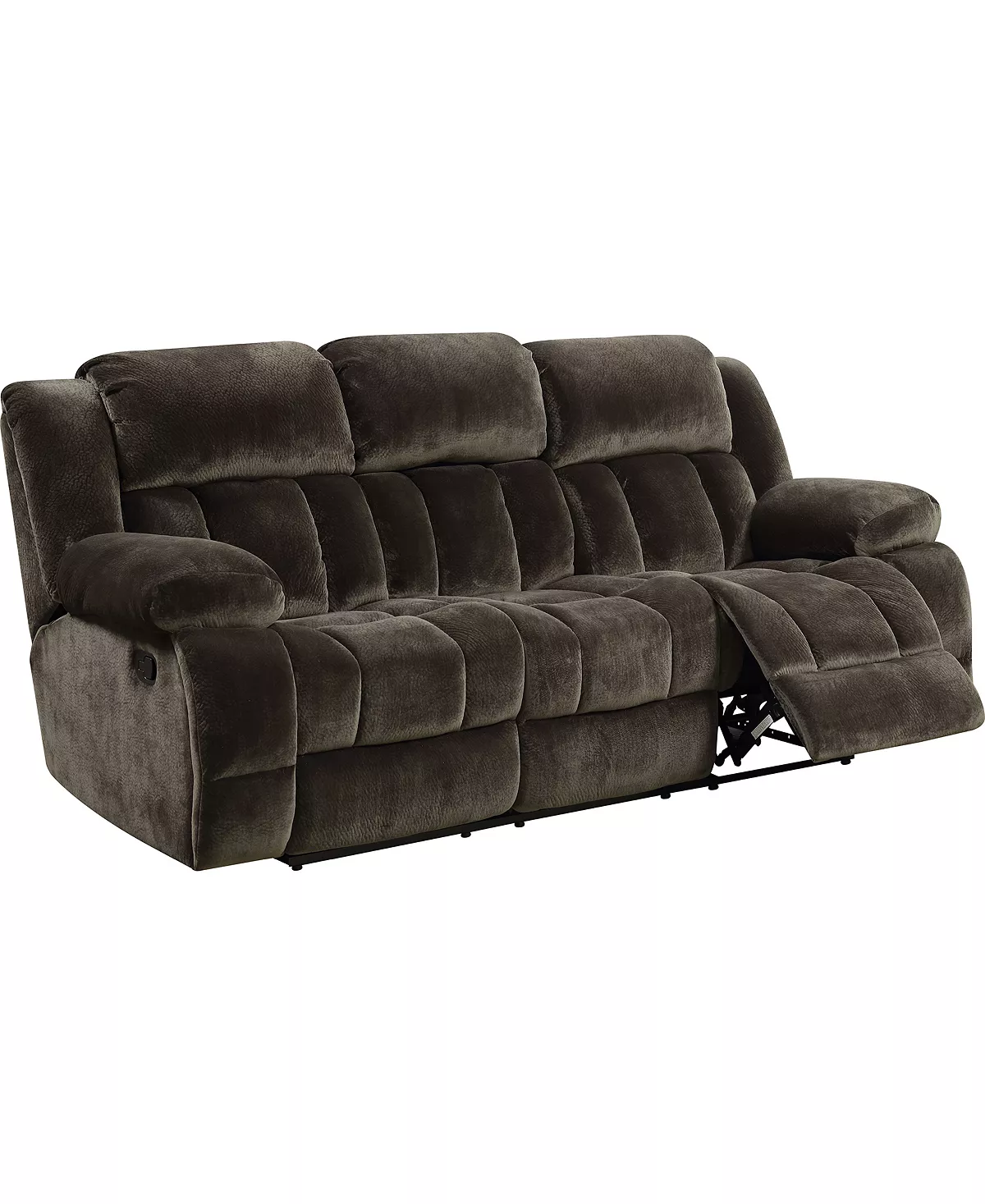 Recline back in this transitional brown sofa and feel the comfort of the soft champion fabric and plush foam padding. The tufted, oversized cushions are paired with a handy cup holder table for the ultimate lounging experience.