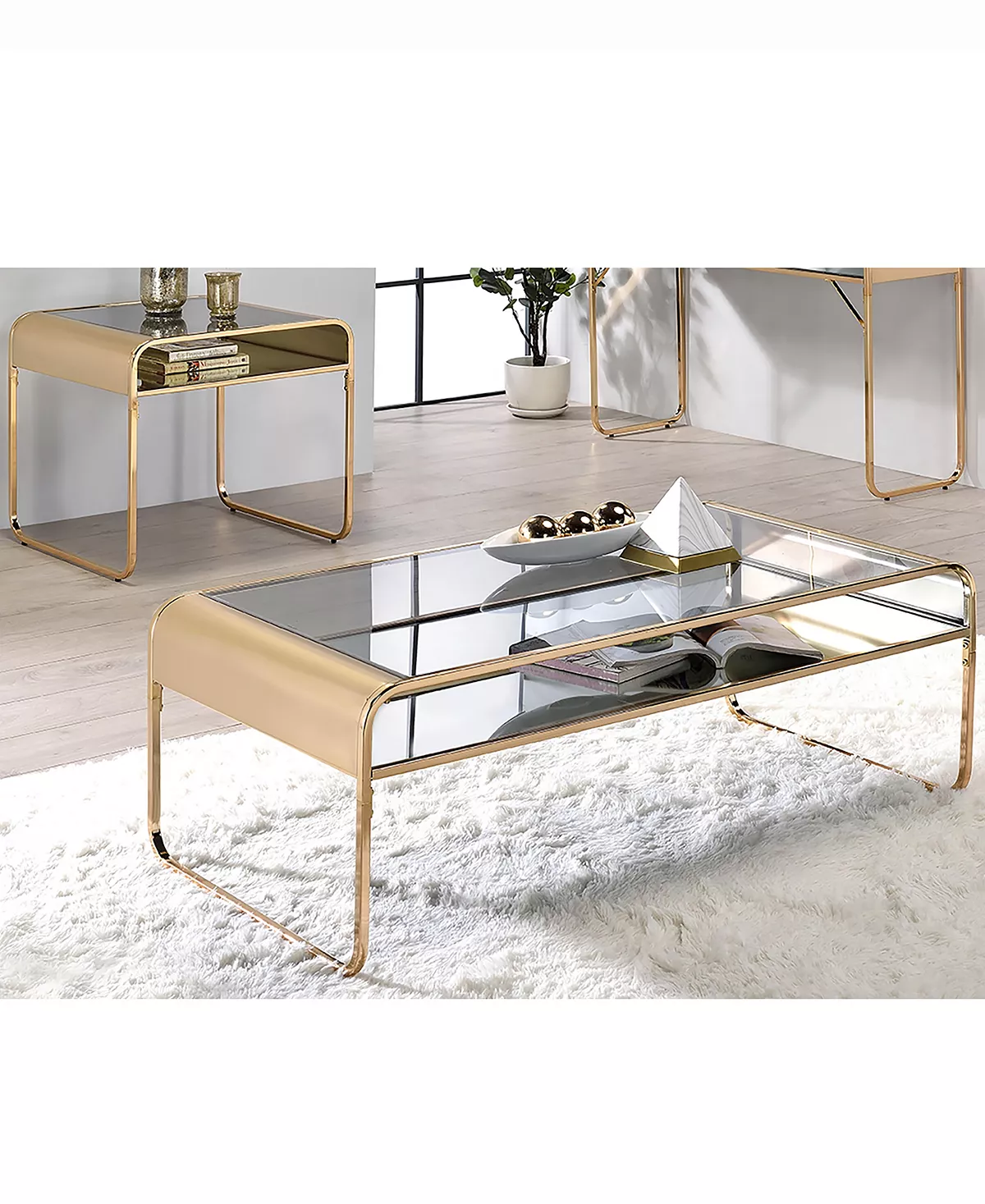 A chic living room display is achieved with this set of steel and tempered glass two-piece table set. Finished in a striking gold color, this set features rounded corners and a center shelf for storage.