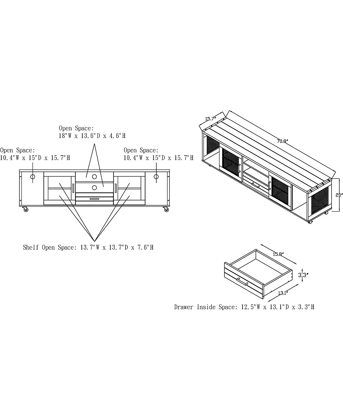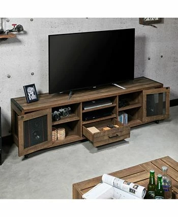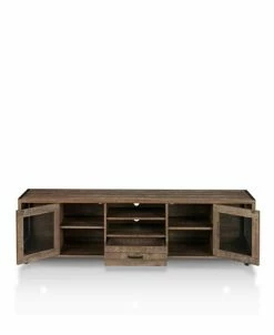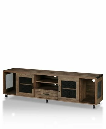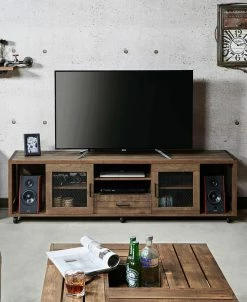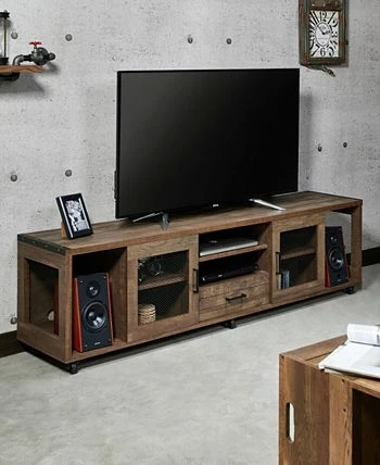 A must-have for living areas and entertainment spaces, this TV stand sets the stage. It’s versatile enough to blend with a variety of design aesthetics. It includes casters for easy transport, while two cabinets and four shelves provide storage.