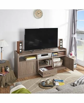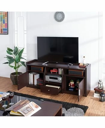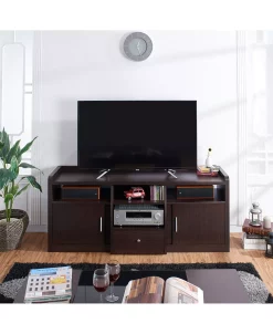 Revamp and refine your home decor, starting with this TV console in your living room! The sleek contemporary lines add a crisp and clean look to the design that leads to a beautiful section along the front of the piece. Easily set up your electronic equipment in the open shelves beneath the top, all of which feature open-back or easy wire access holes to make plugging your devices in even easier. Store your gaming accessories in the side cabinets where they can be out of the way until they’re ready for use while keeping your TV remote controls and other tools in the centered lower shelf. Available in three finishes to make your living room stand out with elegant style, this TV console is the perfect addition for any home.