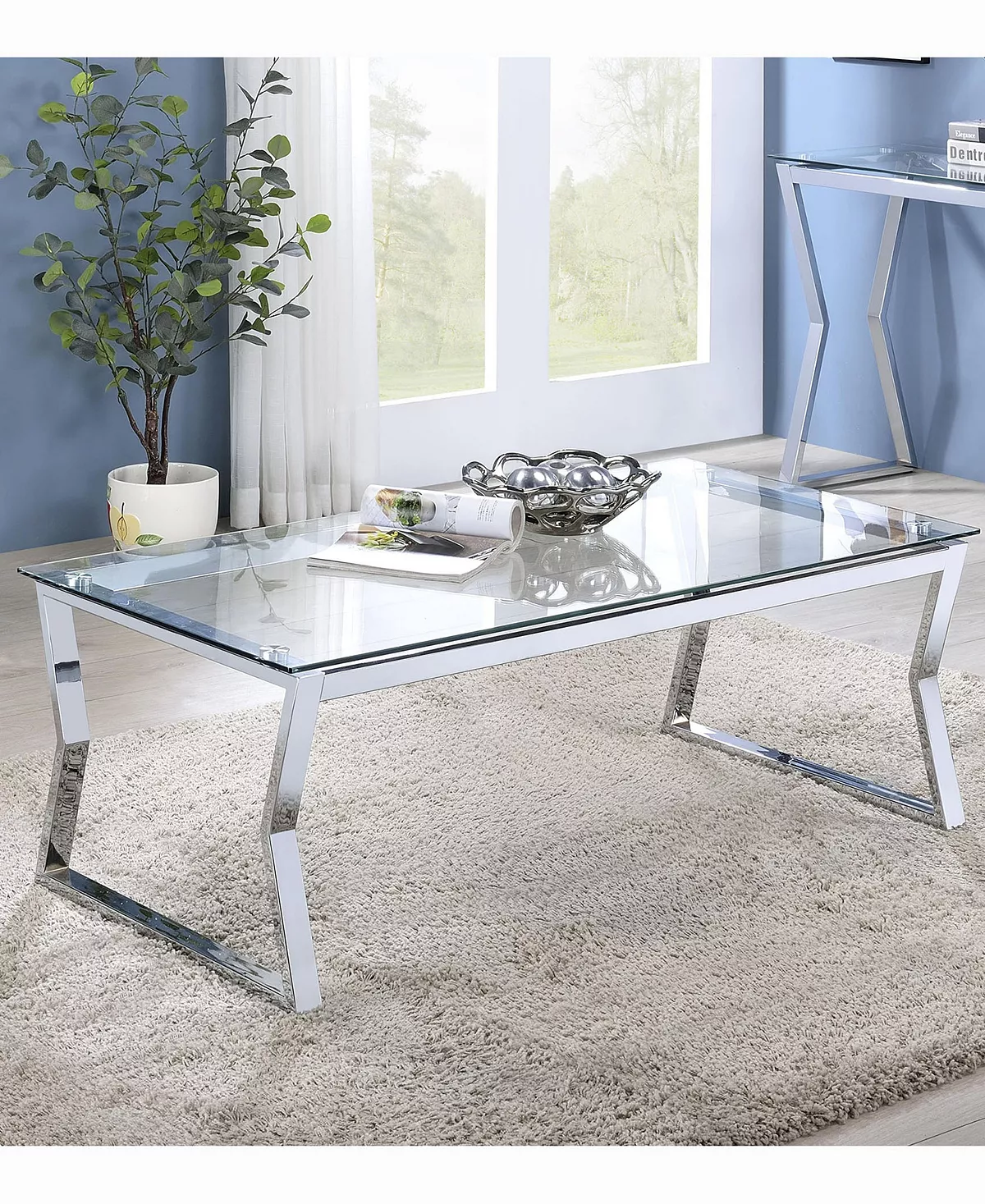 Add a glam look to your living room, den, or family room seating area with this contemporary metal and glass coffee table. It comes with a rectangular top fashioned with tempered glass and hourglass shaped metal legs.