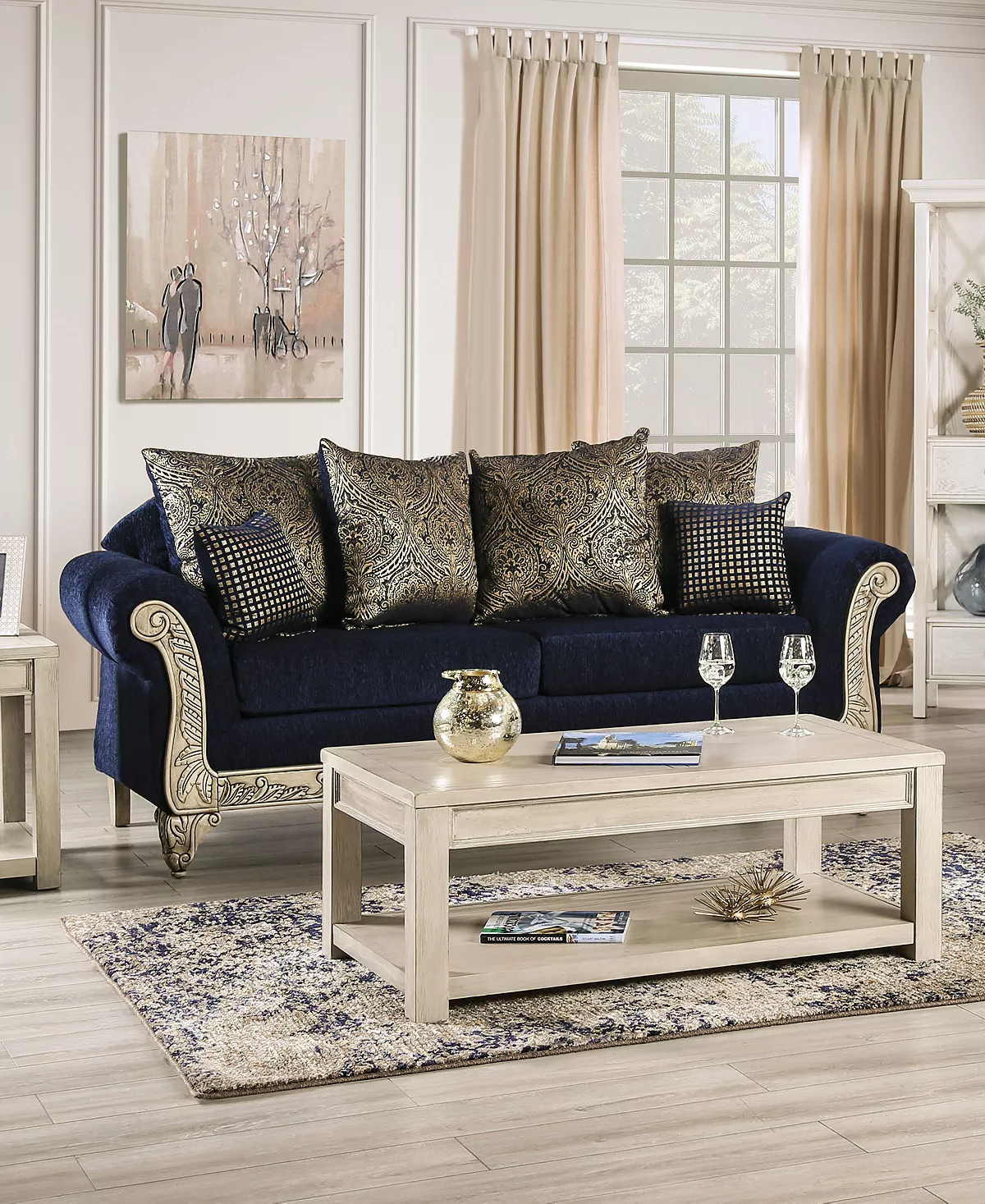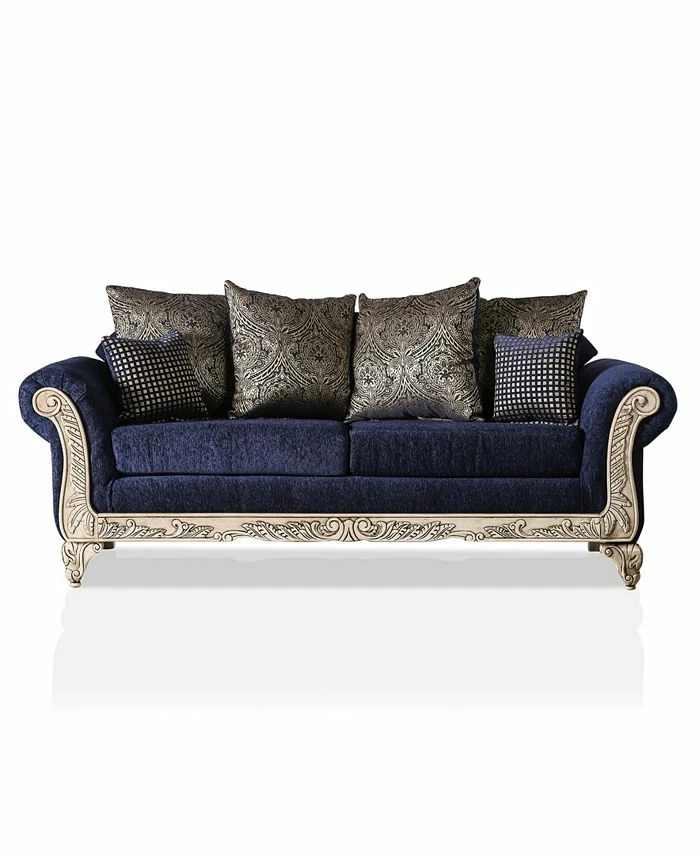 Regal and refined, this gorgeous chenille sofa blends bold patterns and colors into a stunning statement piece. Dramatic wood carvings and patterned pillows add drama and elegance to a traditional living space.