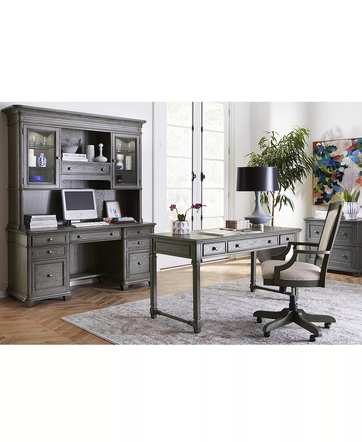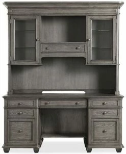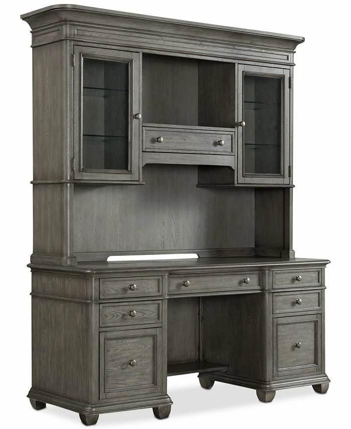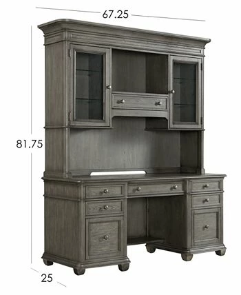 Spruce up your work space and boost your productivity with this handsome credenza and hutch that organizes your accessories and files in style. Ample drawer and shelf space offer room for necessities, and the traditional design is modernized by a soft gray wash and bronze-tone hardware.