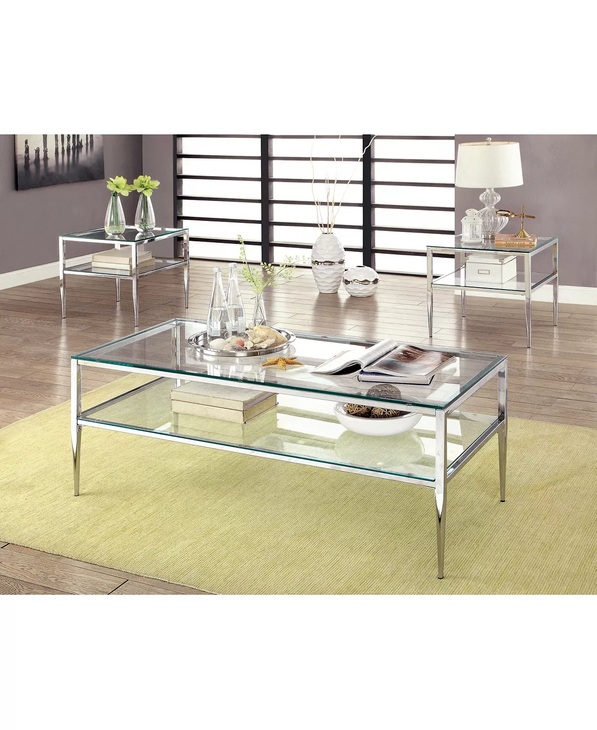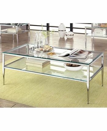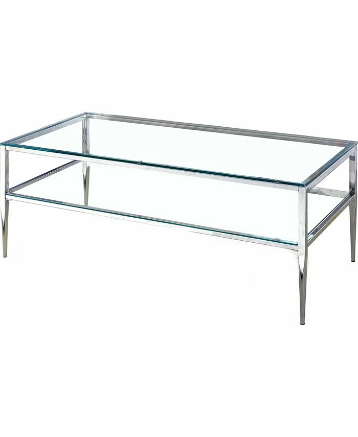 Incorporate contemporary, cutting-edge design into your living space with this sleek glass top and shelf Venzini coffee table. The table features tempered glass for added durability and comes in two color choices, gold and chrome. Complete the set with matching sofa and end table, sold separately.