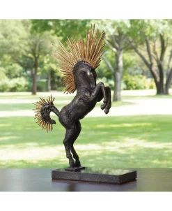 The fierce brass Mohawk on this iron stallion makes this an exciting and original accent. It is made from cast iron with a black granite base. The mane and tail are made of brass plated iron rods.