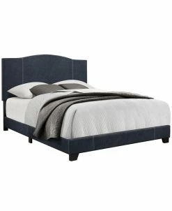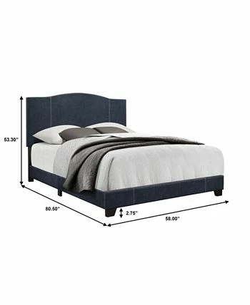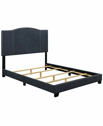 - Modern styled bed with a modified camel back headboard shape with contrast stitching
