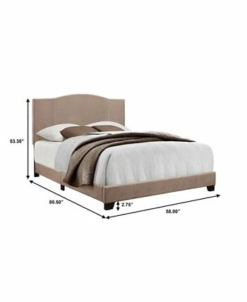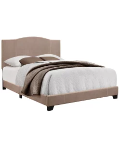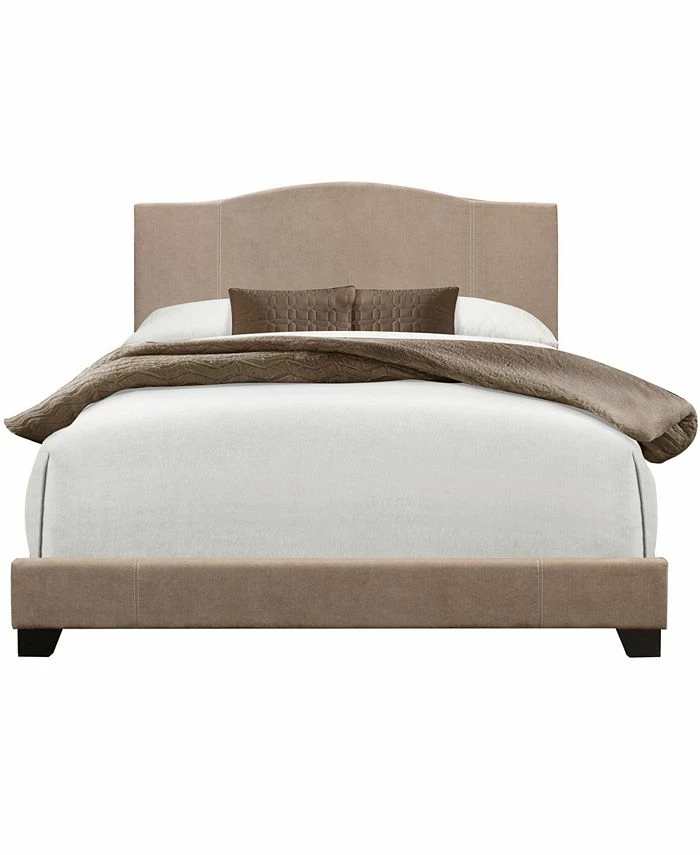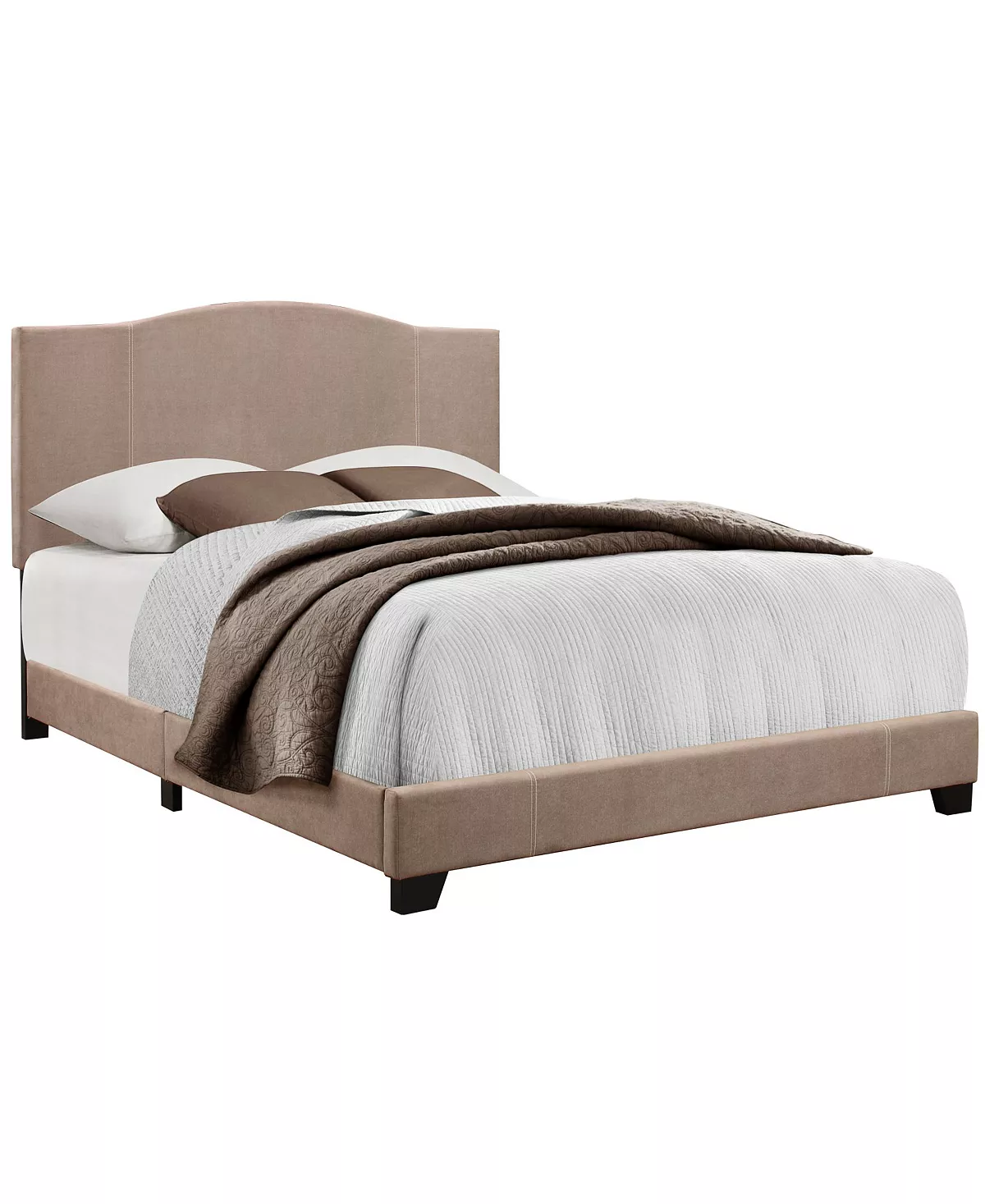 - Modern styled bed with a modified camel back headboard shape with contrast stitching