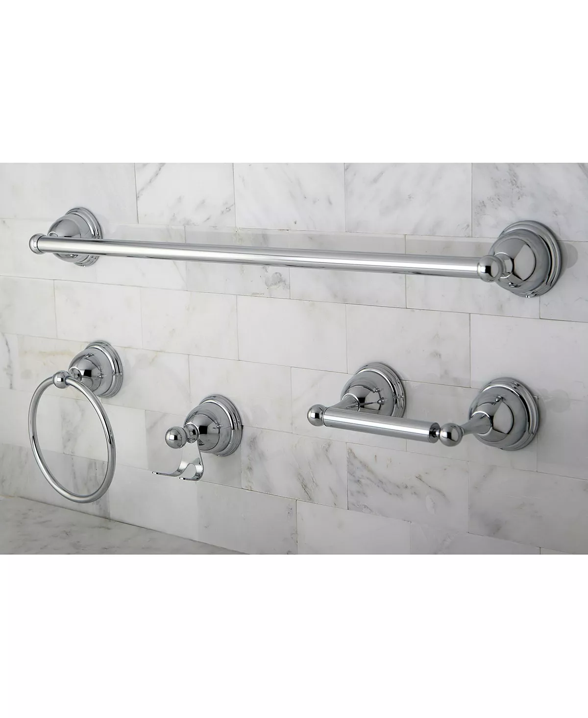 This all inclusive set of bathroom accessories features intricate detailing for a luxurious and astonishing style. One towel bar, towel ring, robe hook, and a toilet paper holder are included for all of your hanging storage needs.