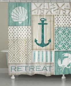 A soft beige and calming spa tones make up a collage featuring coastal-themed images, patterns and the word “retreat” to create a relaxing, serene environment in your bathroom. All of our products are digitally printed to create crisp, vibrant colors and images.