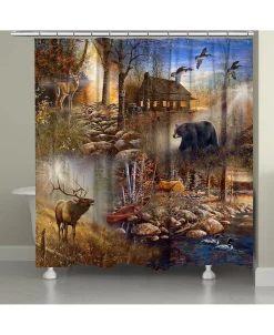 Bring the outdoors into your home with this fun collage of rustic outdoor imagery. Marvel at the realistic wildlife scenes. This shower curtain will complement any lake, lodge or cabin decor.