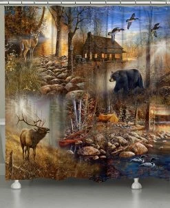 Bring the outdoors into your home with this fun collage of rustic outdoor imagery. Marvel at the realistic wildlife scenes. This shower curtain will complement any lake, lodge or cabin decor.