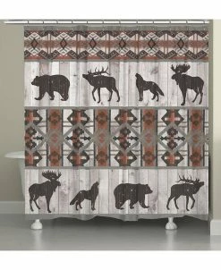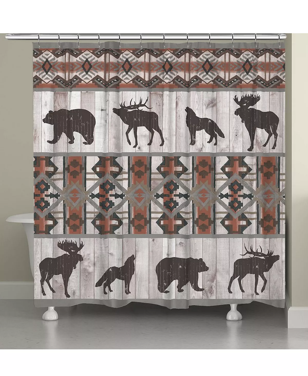 The sophisticated Southwestern pattern and wild animal icons fit perfectly in any lake, lodge or countryside home. The stylish pattern is set on a gray wooden planked background with terra cotta colored accents.