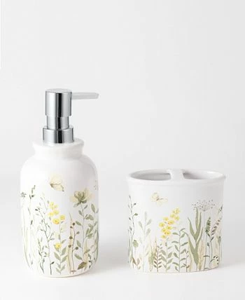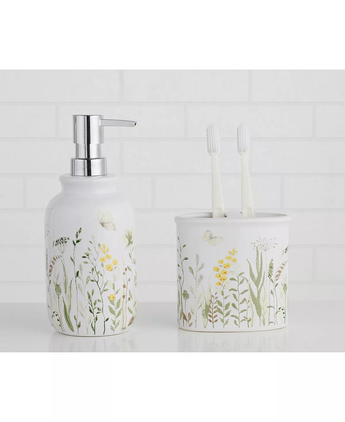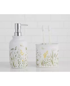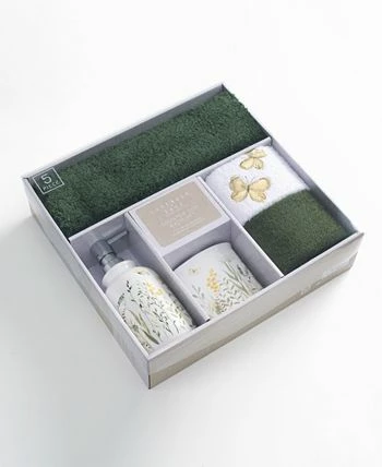 Spruce up your space with this 5-piece set! Great for a guest bath or even vanity in your home. Each set includes a soft 17” x 24” tufted bath rug, 2 cotton hand towels and a gorgeous textured ceramic dispenser with matching toothbrush holder.