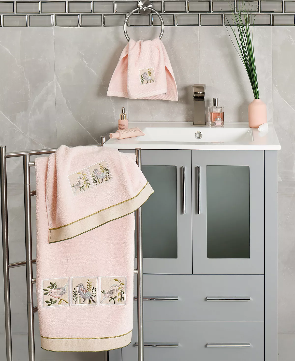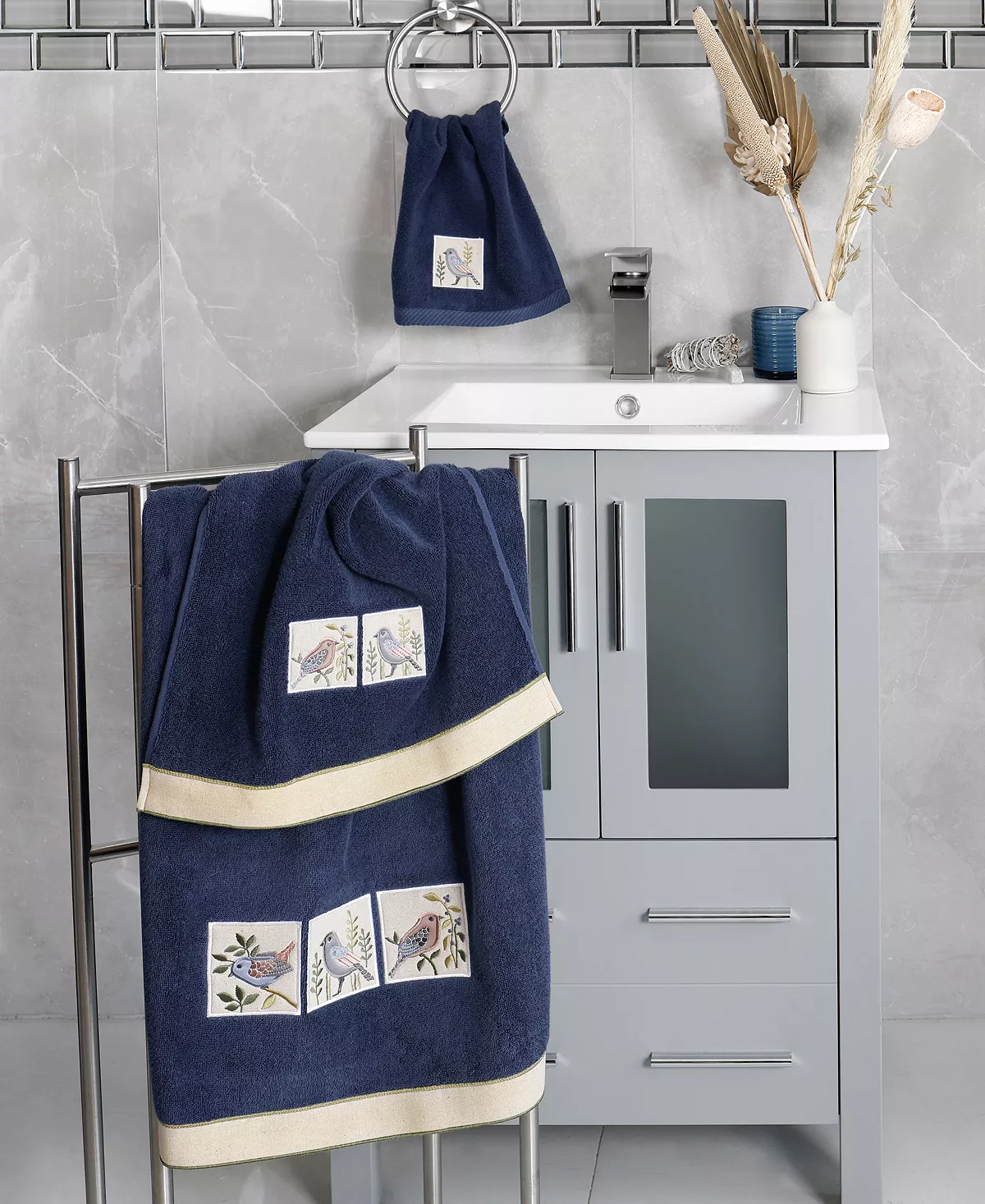 The BELINDA towels feature charming applique birds and are trimmed with a muslin border. Cloud soft and absorbent, these luxurious, durable towels keep their plush appearance after washing. The BELINDA towel collection brings a country spirit and richness to your home decor and makes a great gift.