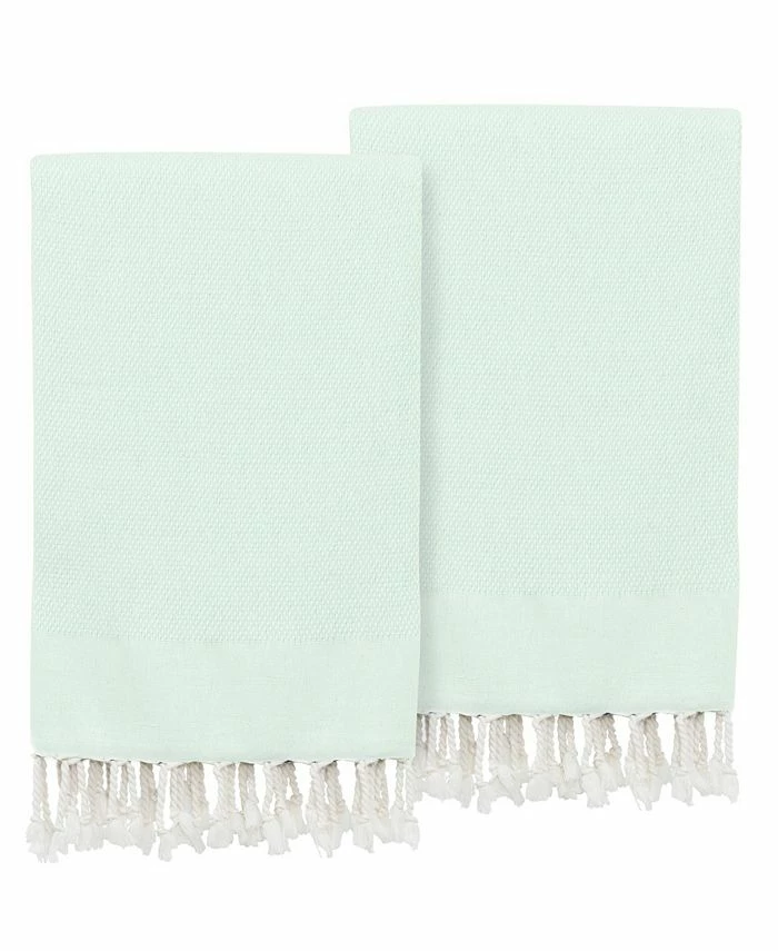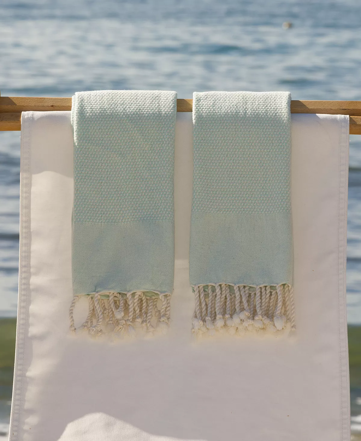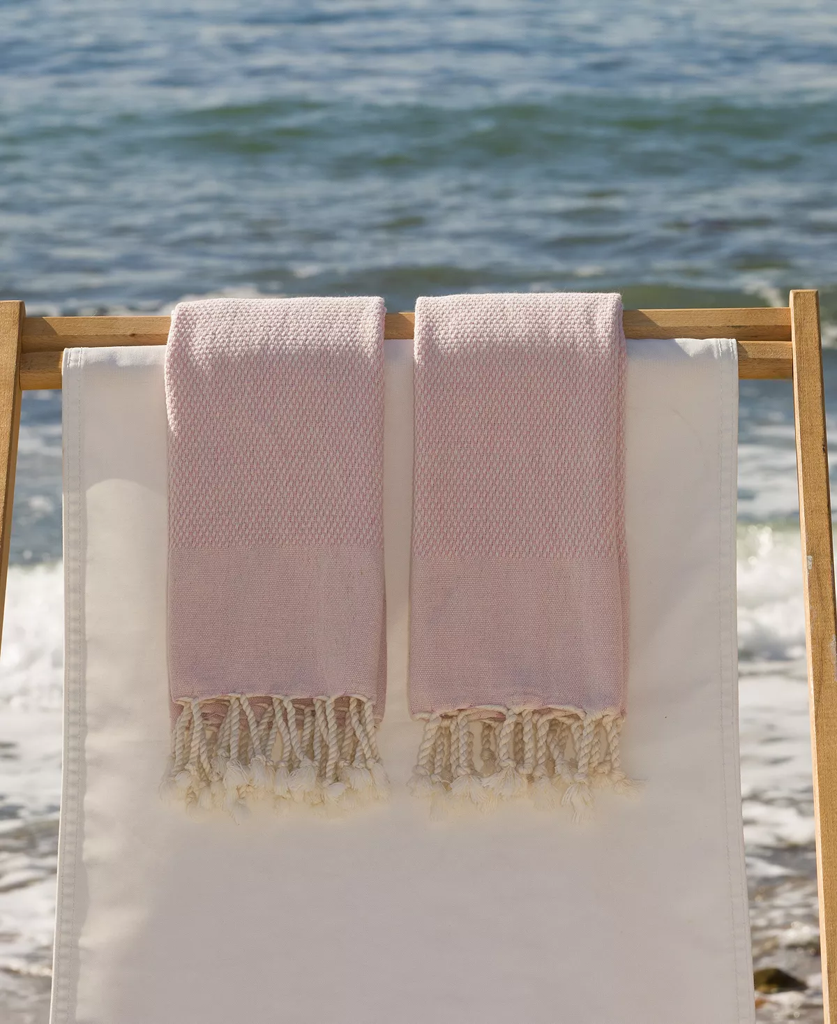 Pamper yourself with the luxurious and extremely soft fun in paradise pestemal hand/guest towel set. Featuring 2 hand towels with hand knotted fringes and a bird’s eye body weave with plain weave border, this pair can be used as a kitchen or guest towel and to dry your hair after the bath.
