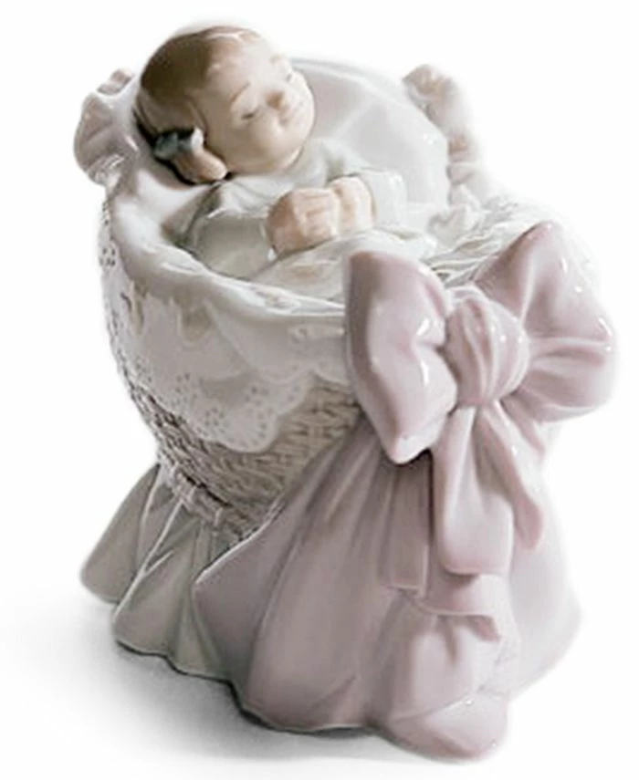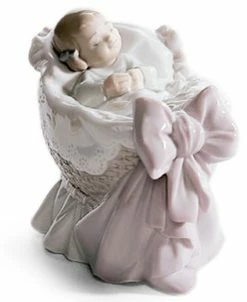 A sweet baby girl in a basket, just welcomed into the world. Crafted by Lladró, Spain’s most esteemed artisans of porcelain figurines.