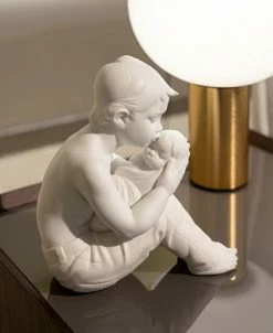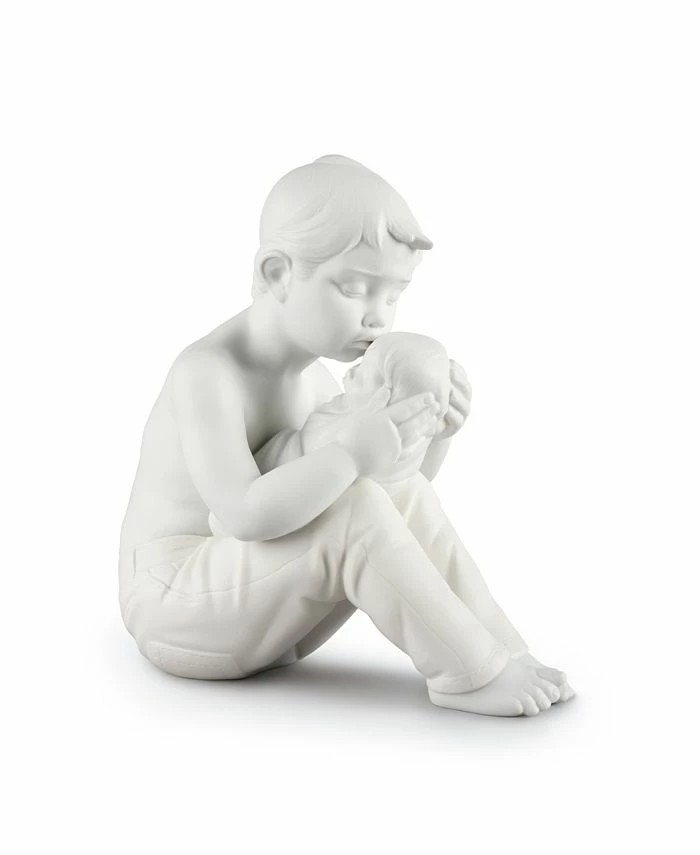 A piece inspired by love between siblings. Here an older brother demonstrates his protective instinct towards a new member of the family. There is no need for words thanks to the evident gesture of tenderness and fond affection between them.