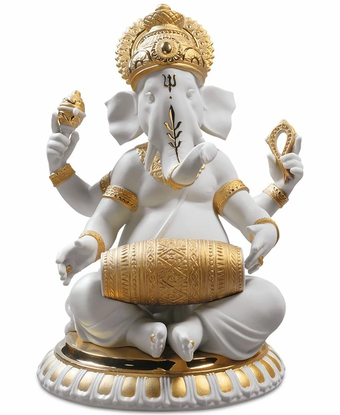 Rich gold-tone detail accents the graceful matte porcelain of the Lladró Mridangam Ganesha Golden Re-Deco figurine inspired by the revered Hindu god.