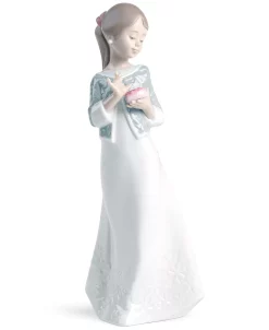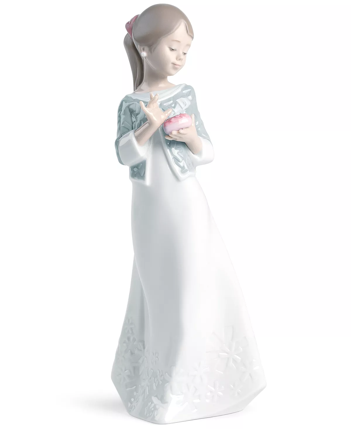 A graceful way of showing you care, this handmade porcelain figurine from Lladro presents a young woman in flowing white with carved detailing upon her dress and sweater wrap.