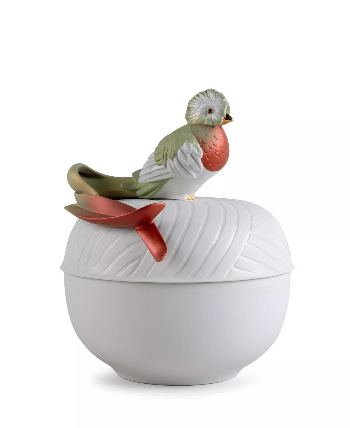 These functional objects are ornamented with beautiful creatures from tropical rainforests. In Quetzal Box the wealth of coloring of the bird contrasts with the matte holder and the varnished details underscoring etching on the lid.