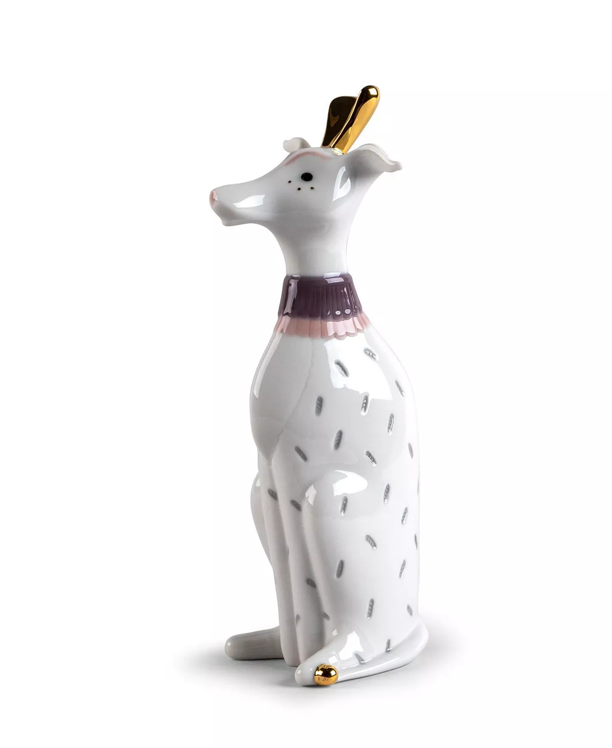 - The pieces in the collection are made in glazed porcelain decorated with enamels and varnishes in pastel tones and golden luster