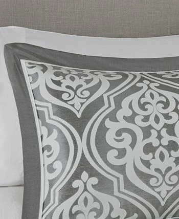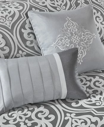 Revamp your bedroom with the Essentials Jordan room in a bag from Madison Park. The jacquard comforter creates a lavish look with its traditional ornate pattern and pieced design in rich hues of gray and white, while the coordinating shams reflect the motif seen on top of the bed. Four decorative pillows with embroidered details and a solid bedskirt provide the finishing touches to complete the collection. Also included are four solid window panels and two valances that allow you to create the perfect balance of style in your bedroom. Each window panel matches back to the bedding set and includes a tieback to give a clean and crisp finish to your decor.