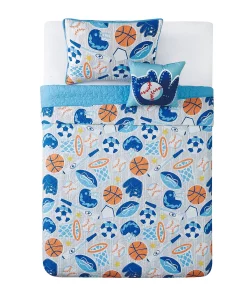 Take your pick with soccer, basketball, baseball, and football icons printed in bright blues on a gray woven fabric with all you need to complete the top of the bed.